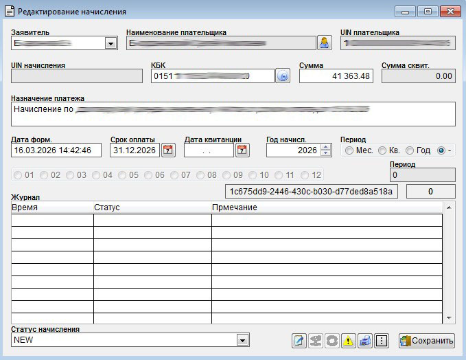 Все остальные поля можно оставить без изменений. УИН присваивается после сохранения начисления в БД. После, как начисление создано, его необходимо подписать электронной подписью заявителя. Далее запрос с начислением пойдет в СМЭВ. Т.е. пока начисление не будет пописано - одно не уйдет.