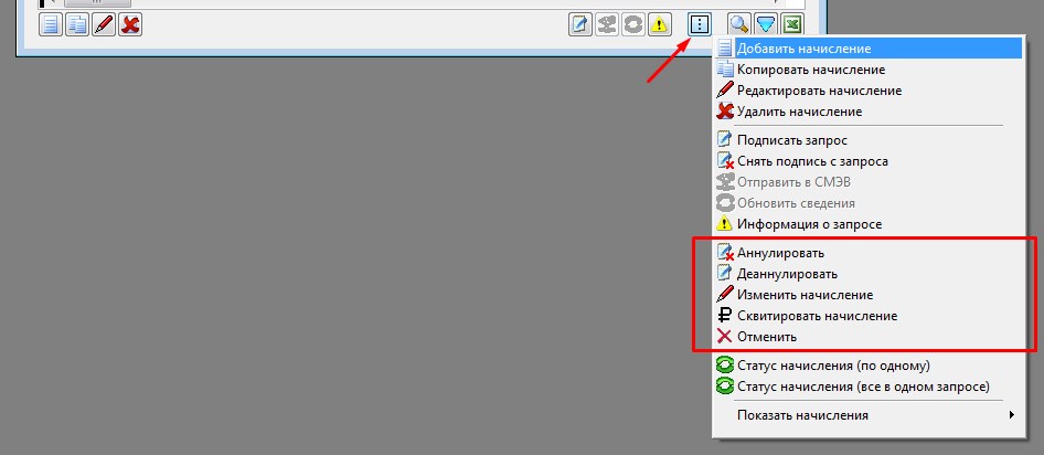 Аннулирование, сквитирование, отмена начислений производиться из формы реестра начислений или в самом начислении. Для выполнения необходимой операции нажимаем на кнопку, показанную на рисунке ниже, предварительно найдя нужное начисление.